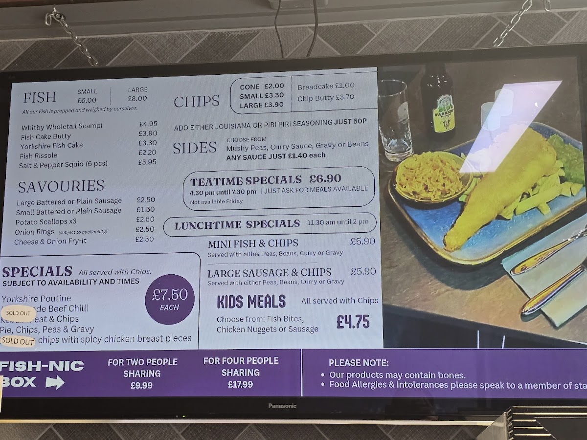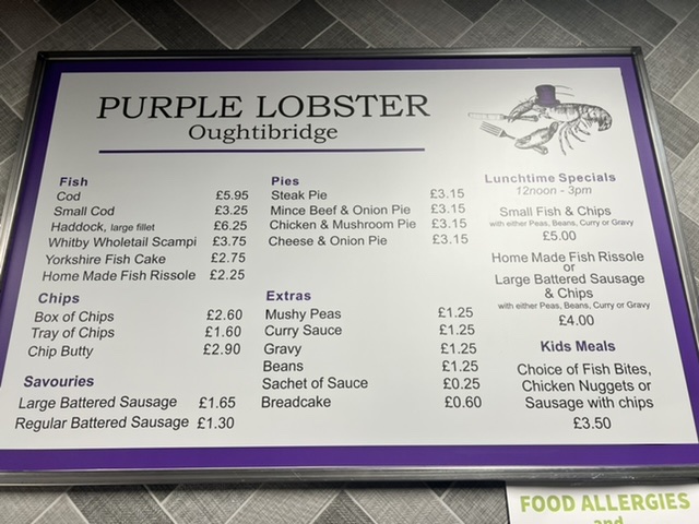 From a reviewer’s perspective, the menu at Purple Lobster feels like a confident celebration of classic British fish and chip shop traditions, carefully balanced with a few comforting extras and hearty specials. The fish selection is the clear highlight, featuring Cod, Small Cod, Haddock, Whitby Wholetail Scampi, and the distinctly local Yorkshire Fish Cake, all of which set a strong foundation for a satisfying seaside-style meal. Chips are treated with equal importance, whether you opt for a simple Box Of Chips, a more generous Tray Of Chips, or the nostalgic Chip Butty. For those wanting something meatier, the savoury options such as Large Battered Sausage and Regular Battered Sausage deliver reliable comfort, while the pie range-Steak Pie, Mince Beef & Onion Pie, Chicken & Mushroom Pie, and Cheese & Onion Pie-adds warmth and variety to the menu. Extras like Mushy Peas, Curry Sauce, Gravy, Beans, and Sachet Of Sauce allow diners to customize their plates exactly to their taste. The value-driven Small Fish & Chips and Home Made Fish Rissole Or Large Battered Sausage & Chips under the Lunchtime Specials make this an appealing midday stop, while heartier specials such as Yorkshire Poutine and Pie, Chips, Peas & Gravy showcase indulgent, regional flair. Finally, items like Fish Cake Butty, Fish Rissole, and Salt & Pepper Squid round out the menu with extra choice. Overall, the Purple Lobster menu feels thoughtfully put together-simple, filling, and focused on doing traditional favourites well.